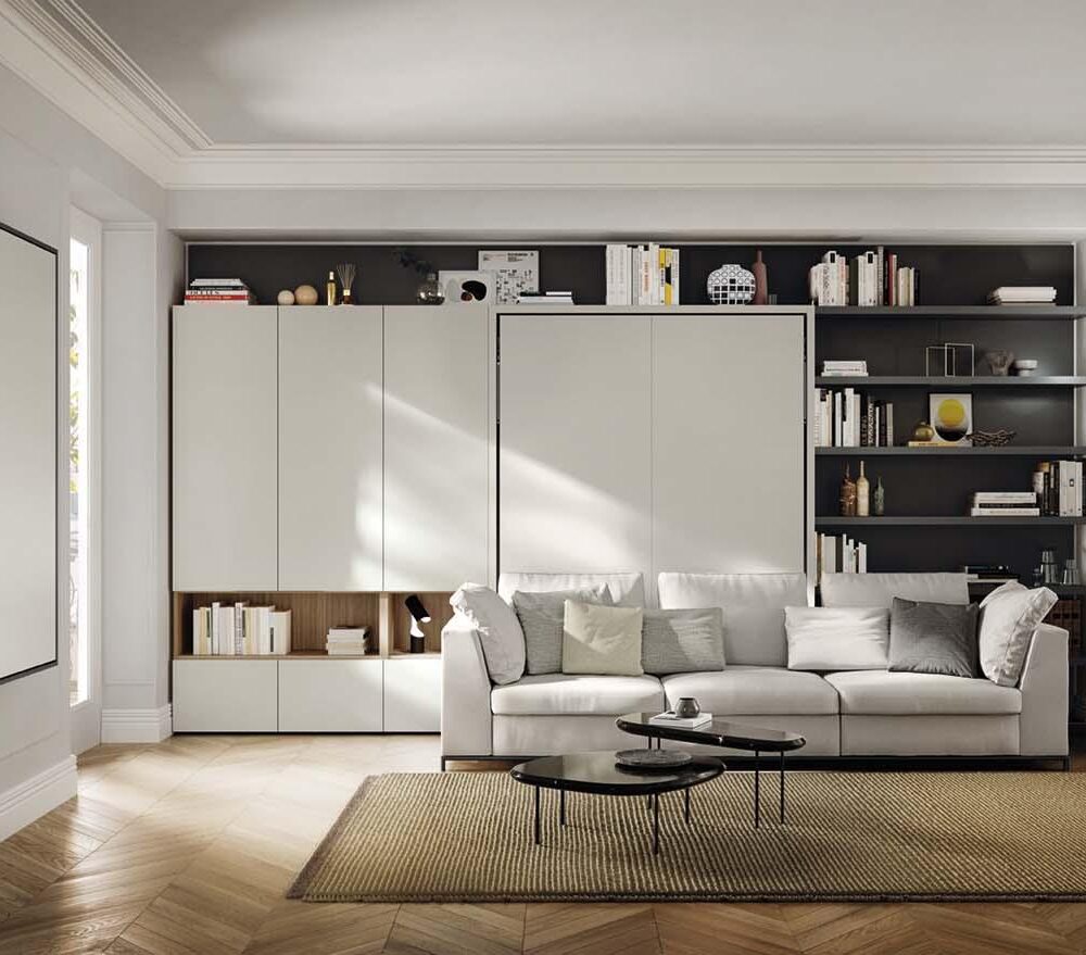 Ce système transformable ultra astucieux combine un lit double escamotable à ouverture verticale et un canapé tout confort au design tout en douceur.