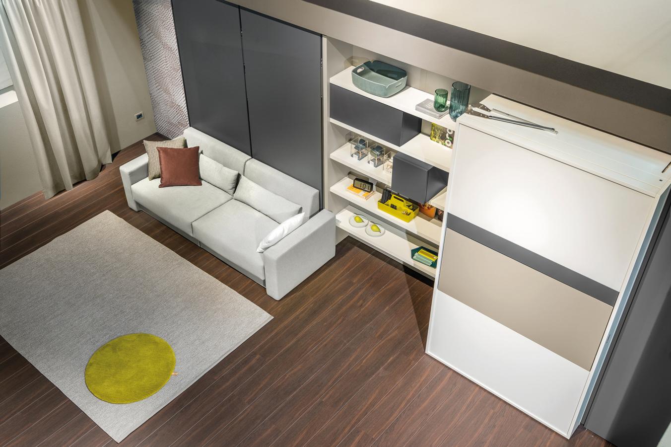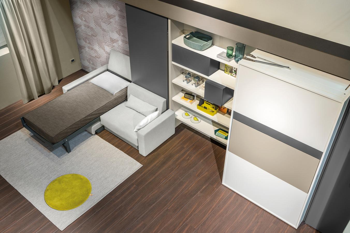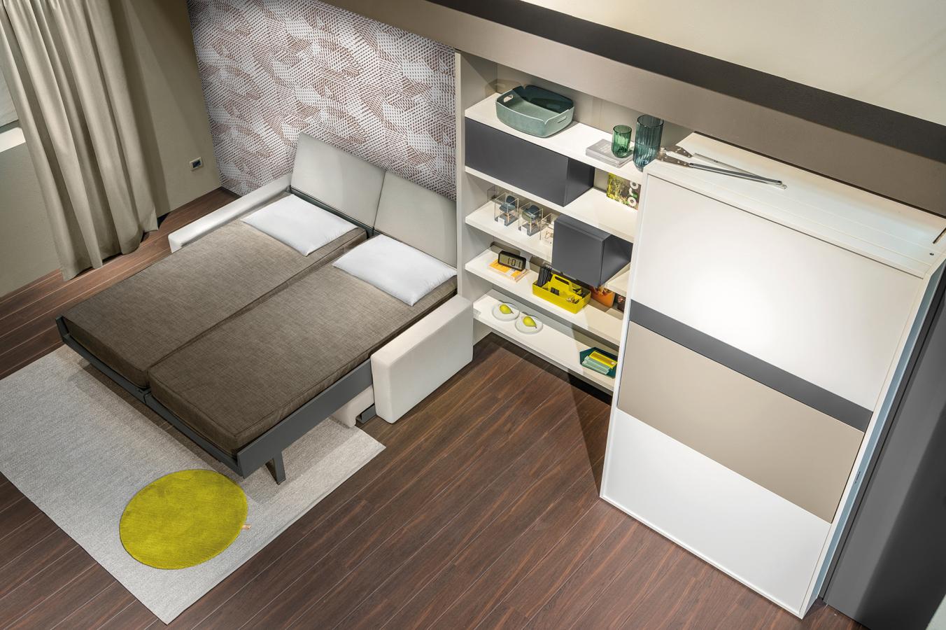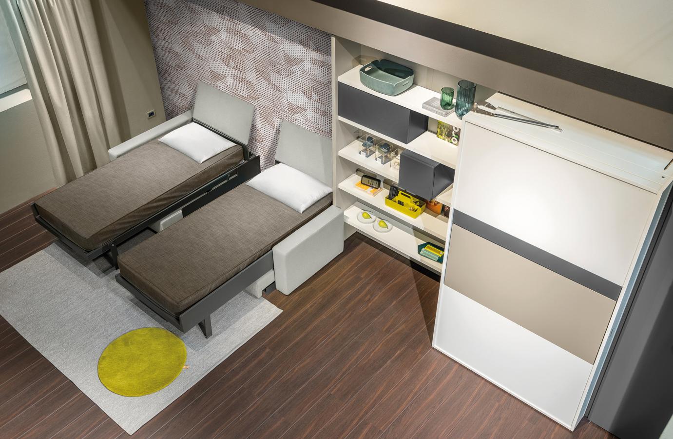 Le canapé-lit Ella & Louis est un système astucieux qui combine un canapé fixe 3 places, un fauteuil et un lit double escamotable transformable en deux lits simples séparés.