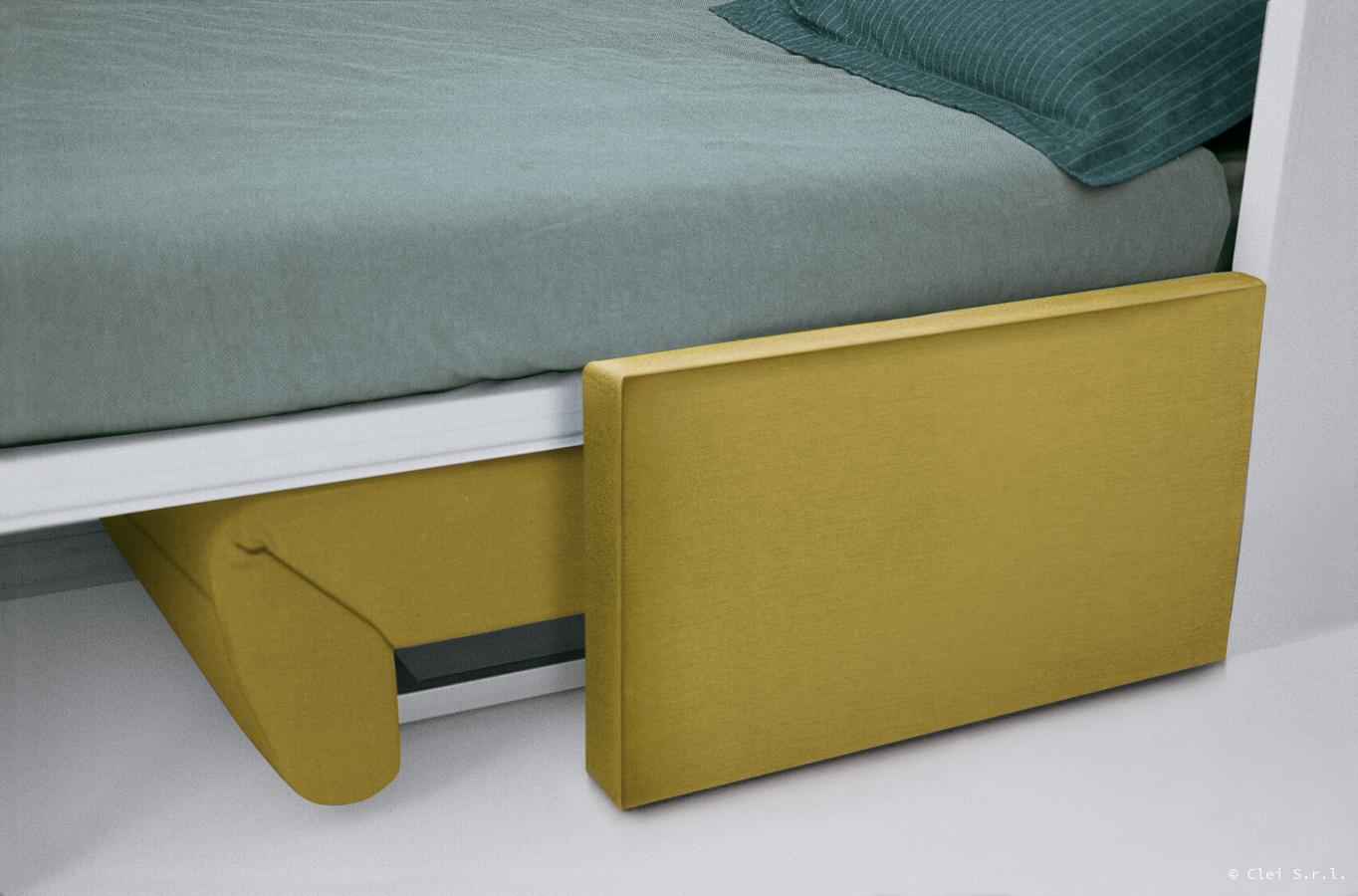 La tablette frontale basculante se transforme en pied de lit, même avec des objets posés dessus.