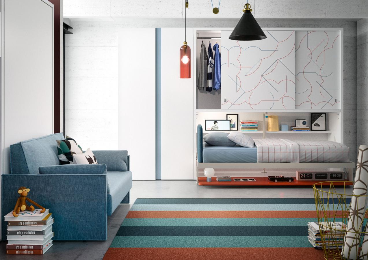 Kali Ponte : chaque version peut être complétée d’une armoire pont de rangement au-dessus du lit, pour exploiter tout le volume vertical.